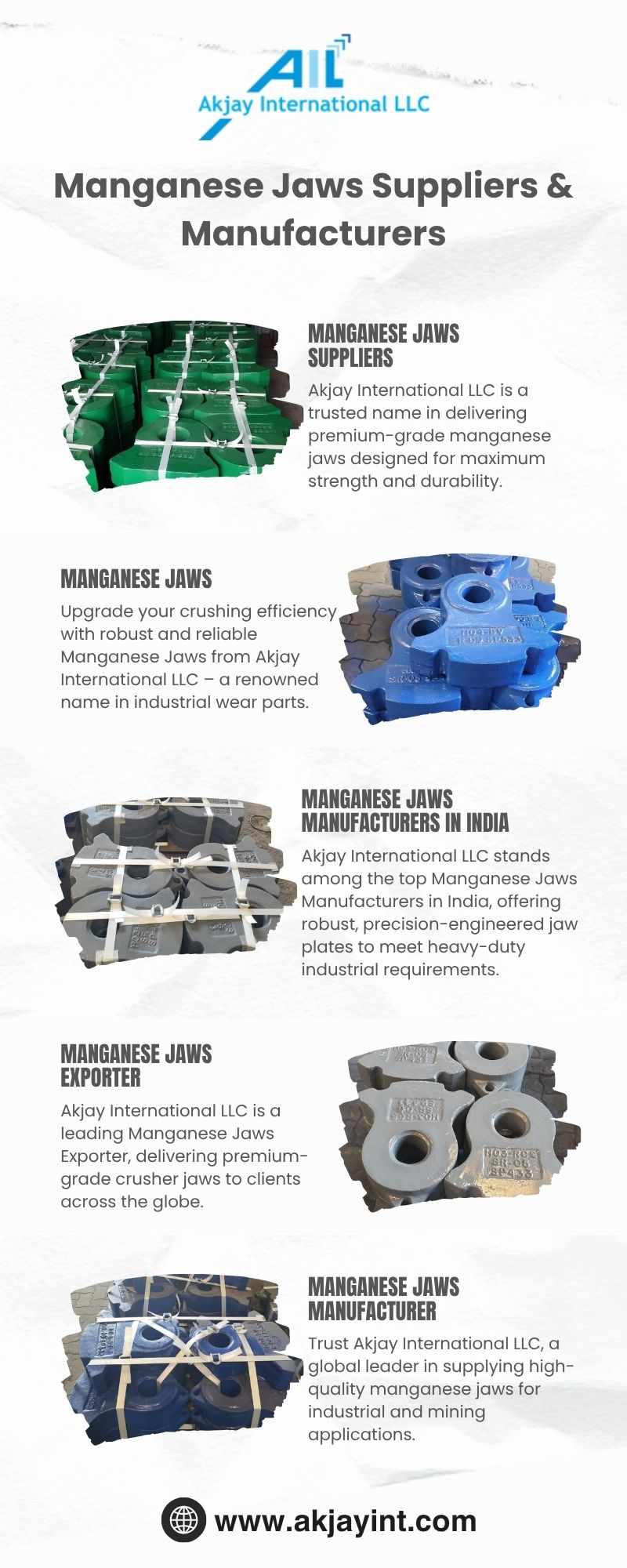 Akjay International LLC is a leading Manganese Jaws Exporter, delivering premium-grade crusher jaws to clients across the globe. Our products are trusted for their resistance, reliability, and exact fit for various industrial machines. Whether you require small or bulk quantities, we ensure consistent quality and prompt export services. As a customer-centric exporter, Akjay International LLC is committed to meeting global demand with competitive pricing and customized solutions. Partner with us for trusted manganese jaw exports.
